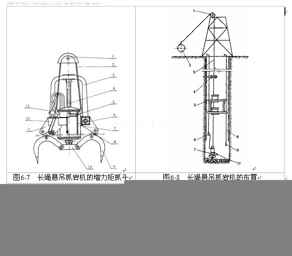 中心回轉抓巖機是一種大斗容抓巖機,它直接固定在鑿井吊盤上,以壓風作為動力,該設備具有使用范圍廣、適應性強、設備利用率高、動力單一、結構緊湊、占用井筒面積不大,便于井筒布置、安全可靠、操作靈活、維護方便等優(yōu)點,目前在煤炭礦山得到了普遍的使用。該機由抓斗、提升機構、回轉機構、變幅機構、支撐系統(tǒng)和機架等部件組成,見圖6-9。