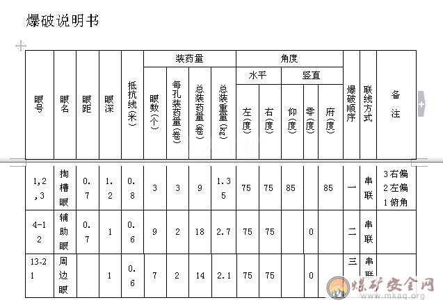3、裝藥放炮:裝藥放炮工按作業(yè)規(guī)程規(guī)定爆破參數(shù)進(jìn)行裝藥檢查,放炮時先放掏槽眼,其次輔助眼,再而周邊眼,巷道成形規(guī)整,不得出現(xiàn)超挖欠挖現(xiàn)象。