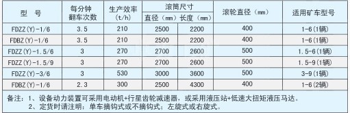 翻車機(jī)又名翻罐籠,其主要規(guī)格為:FDZ(B)Z(Y)-1(1.5)/6(9)。它是礦山和煤礦使用固定式礦車運(yùn)輸中轉(zhuǎn)的主要卸料設(shè)備,具有生產(chǎn)效率高、使用簡(jiǎn)單、安全可靠等特點(diǎn)!